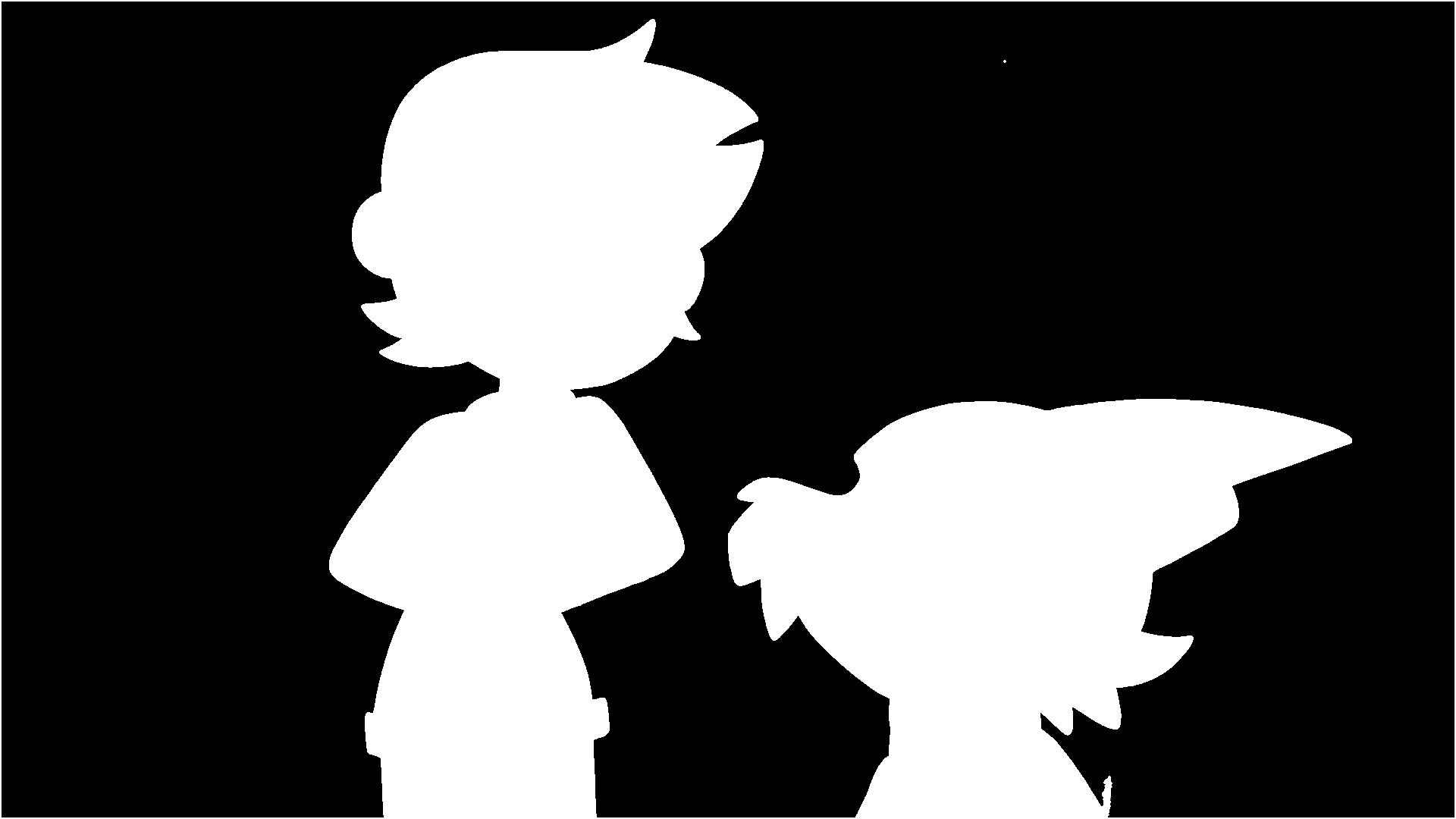 The final stage, I apply the mask to the original RGB frame buffer. At this point, you hopefully see just the characters! You can notice those pockets of background, and the linework has a noticeable edge of the background artwork on the outside of the line, but this worked pretty effectively for a C program and technique I cooked up in a weekend or so.